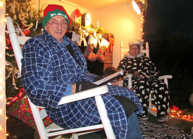 2014-12-06 - Morgan-Smith Mfg., Industrial Drive, Columbia, KY - Photo (c) ColumbiaMagazine.com. Pastor Bobby Withers of the Emory Chapel United Methodist Church sat in a rocking chair for he parade, above before the start of the parade as floats were still being judged.