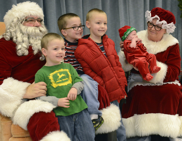 2014-12-07 - Columbia, KY - Photo by Duane Bonifer. Members of the Janes family of Columbia were among the more than 250 area children who visited with Santa and Mrs. Claus Saturday at the fourth-annual Christmas Carnival, held in the Doris and Bob Holloway Health & Wellness Center. From left: Alexander, 3; Andrew, 5; Adam, 5; and newborn Arabella. Their parents are Timothy and Tabitha.