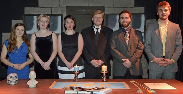 2014-12-05 - V.P. Henry Auditorium, 210 Lindsey Wilson Street, Columbia, KY - Photo by Duane Bonifer, LWCer. New members of the Lindsey Wilson College Chapter of Alpha Psi Omega National Theatre Honor Society are, from left: Suzie Herrington, a theatre junior from Junction City, Kan.; Julie Ford, a theatre and communication sophomore from Tompkinsville, KY; Sarah Wood, an English and theatre senior from Bowling Green, KY; Seth Slone, a human services and counseling, Christian ministries and theatre senior from Danville, KY; Kyle Hornback, a theatre and psychology sophomore from Mammoth Cave, KY; and Ulis Lingar, a criminal justice senior from Fourmile, KY