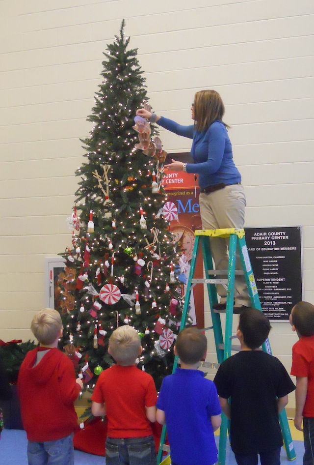 2014-12-05 - 500 Public Square, Columbia, KY - Photo by Ellen Zornes. Lee Ann Jessee of the Adair Heritage Association was busy hanging the greens on the handrails at the Main Entrance (Jamestown Street as anyway who reads Mike Watson knows) in preparation for Ye Olde Christmas Shoppe, which is this year features vendors with crafts, baked goods, books and other items for Christmas Shoppers. Ellen Zornes, President of the Adair Heritage Association, said that there will be Christmas in Columbia vendors in Mackie Jo's Building, 100 Public Square, and at the Masonic Building, 501 Burkesville Street. The day is setting up to be a record - and these events are weather proof. "Ye Olde Christmas Shoppe will be open regardless of the weather."