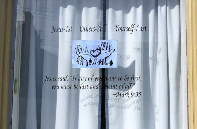 2014-12-04 - Photo (c) ColumbiaMagazine.com. About as Christmas as it should get: This message on the window of Joy Baptist Church is a good keynote for the Christmas Season. It's in the window of Joy Baptist Church, 109 Campbellsville Street, KY.