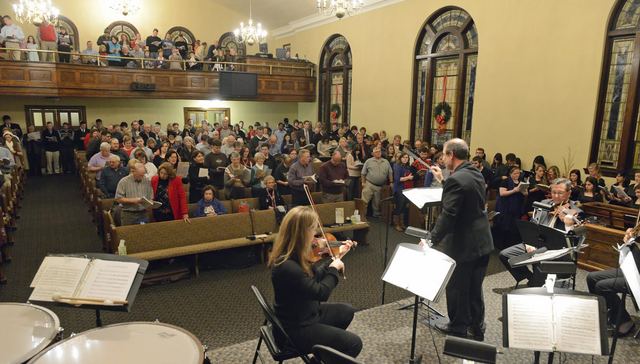 2014-12-03 - 201 Greensburg Street, Columbia, KY - Photo by Duane Bonier. Lindsey Wilson College Director of Choral Programs Gerald Chafin conducts George Frederic Handel's Messiah during the Messiah-Sing Tuesday night at Columbia Baptist Church. The community event - the second time the LWC choral program has sponsored it - attracted a crowd that packed the church's sanctuary. Music for the sing-along to the 18th-century oratorio was provided by the Louisville Symphony. The concert was also conducted by LWC Instructor of Music Wan Soo Cho. - Duane Bonifer, Lindsey Wilson College