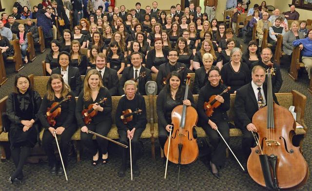 2014-12-03 - 201 Burkesville ST, Columbia, KY - Photo by Duane Bonifer, LWCer. Members of the Lindsey Wilson College choral program and Louisville Symphony gather for a group picture before Tuesday night's Messiah-Sing at Columbia Baptist Church. The community event - the second time the LWC choral program has sponsored it - attracted a crowd that packed the church's sanctuary. The concert was conducted by LWC Director of Choral Programs Gerald Chafin and Instructor of Music Wan Soo Cho. - DUANE BONIFER