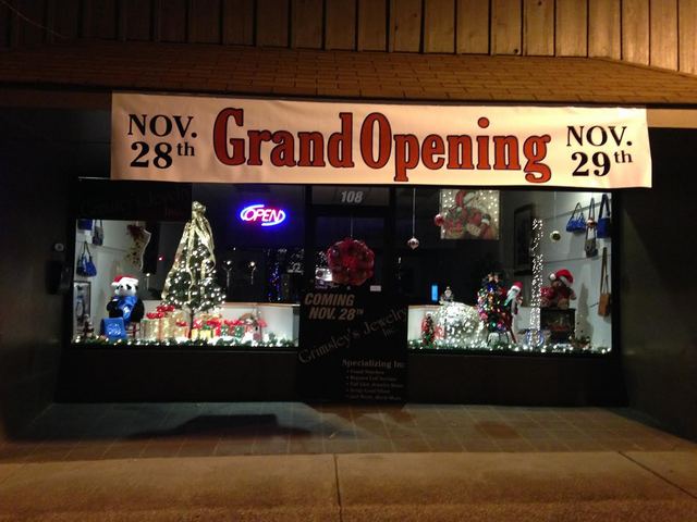 2014-11-27 - 108 E Public Square, Glasgow, KY - Photo by Holly Grimsley. Charles & Holly Grimsley will have the Grand Opening of their second Grimsley's Jewelry at 108 E Public Square, Glasgow, KY, on Friday & Saturday, November 28 & 29, 2014. The store will offer the same merchandise as the Columbia Store, located at 102 Public Square, Columbia, KY, with jewelry, watch and jewelry repair, the Fossil line of purses and wallets, and an expanded UK line. Holly Grimsley will be the manager of the Glasgow Store at the outset. The store will be open Tuesdays through Saturdays, 9am-5:30pmCT. The phone number at the new store is Phone 270-629-GEMS (4367). Grimsley's Jewelry is now 62 years old. It was started in 1952 by the late Pleas Grimsley in a 100 s.f. boutique inside the Adair (Miller) Hotel on the Square in Columbia, KY.