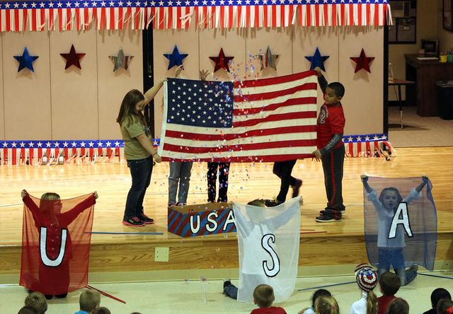 The finale of the ACPC patriotic musical – displaying the American flag with confetti! Shown here are Kady Morrison, Marcus Crawdus, Millie Brown, Jagger Kemp and Jazzy Kemp. Yesterday, Monday, 24 Nov 2014, the 2nd grade presented their patriotic musical tribute to their classmates. It was a wonderful event, with great music, all American themed. - Shamarie Claiborne