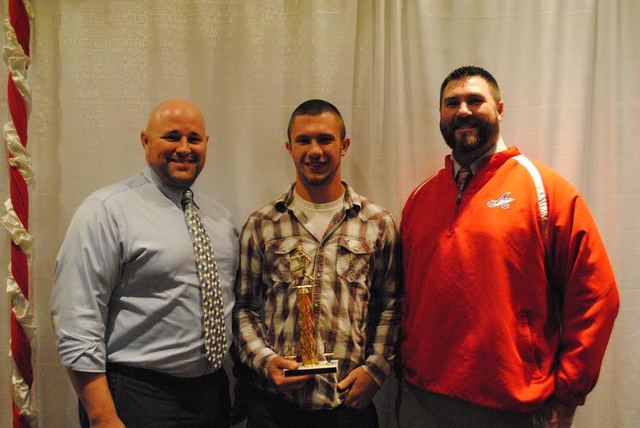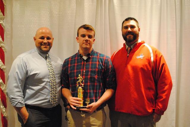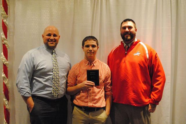 2014-11-25 - Paroquet Springs Conference Center,395 Paroquet Springs Dr, Shepherdsville, KY 40165 - Photo by Cathy Luttrell. 2014 Pioneer Athletic Conference 2nd Team All-PAC award to Dylan Conn, pictured with Assistant Coach Robert Meacham and Coach Travis Gay. - CATHY LUTTRELL. Photo Mon 24 Nov 2014