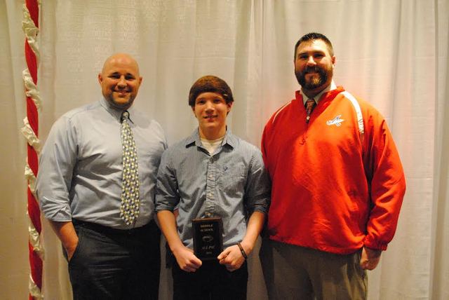 2014-11-25 - Paroquet Springs Conference Center,395 Paroquet Springs Dr, Shepherdsville, KY 40165 - Photo by Cathy Luttrell. 2014 Pioneer Athletic Conference All-PAC Middle School Team Award to Winston Lyons, pictured with ACHS Assistant Coach Robert Meacham and Coach Travis Gay. - CATHY LUTTRELL. Photo Mon 24 Nov 2014