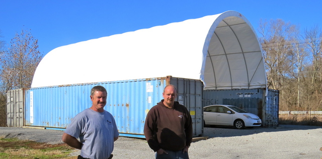 Ed Pipalski, the owner of Ed's Small Engines, left, and Clay Jones, technician, are seen above in front of the innovative warehouse the company, with the help of Chester Taylor, Columbia, KY, finished on November 4, 2014 of this year. The building has appealing symmetry and was built in a most econonomical way. It has over 2,200 s.f. with 960 s.f. totally enclosed within the three 40' x 8' shipping containers which comprise the base and perimeter. A Farm Tech clear span, fabric covered arch building in the center, adds another 1,248 s.f. The building is positioned to take advantage of a an enclosed SW side, to give stored items greater protection against bad weather borne by prevailing winds. Conceivably, the building system could be adapted to a cozy residential situation with a little imagination, but not at the under $7.50 s.f. estimate for this building. Paired Photo: See also Warehouse built by Ed Pipalski