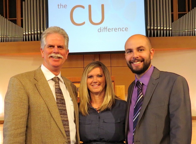 2014-11-19 - Ransdell Chapel, 401 N Hoskins Avenue, Campbellsville, KKY - Photo by Linda Waggener, CU. The Rev. Ed Pavy, left, introduced the Thanksgiving chapel service speaker, Greensburg Baptist Church pastor Blake Jessie, Pavy's son-in-law, at right. In the center is Pavy's daughter, Emily Pavy Jessie. - Linda Waggener
