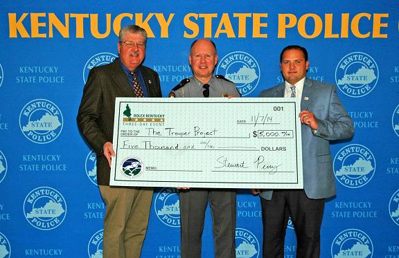 2014-11-12 - Frankfort, Ky - Photo from TFC William Gregory. Stewart Perry, president of Equestrian Events, Inc. (EEI) in Lexington, KY and Lee Carter, executive director of EEI, presented a $5,000 check to KSP Commissioner Rodney Brewer, in support of The Trooper Project. EEI is widely known within the equine industry and produces the annual Rolex Kentucky Three-Day Event. The Trooper Project is an effort to build a memorial statue to fallen troopers and officers and will be housed at the KSP Academy in Frankfort. Visit www.thetrooperproject.com for more information. - TFC William Gregory, Public Affairs Officer, Kentucky State Post 15, Columbia, KY.