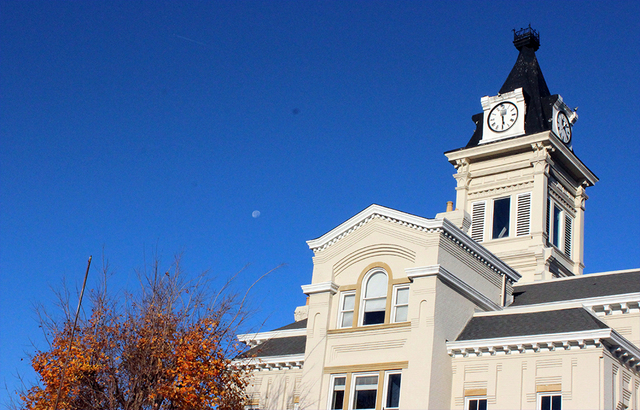 Topside: Clocktower & daytime moon, Historic Adair Courthouse