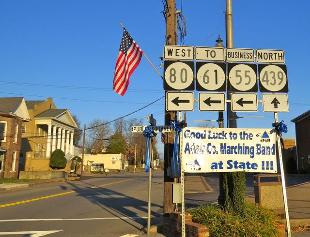2014-11-11 - Public Square & Greensburg Street, Columbia, KY - Photo (c) Collumbia KY. The City of Columbia Flags are up for Veterans Day, for today, Tuesday, November 11, 2014, around the square and a few blocks out each of the main streets. At the corner of Greensburg & the Public Square, a large sign recognizes the ADAIR Band, which finished 2nd in the State championships. The band will compete at 9:30pmET, at Lucas Oil Stadium, 500 S. Capitol, Indiananapolis in the Bands of America Grand National Competition.