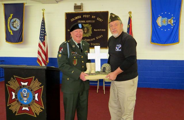 2014-11-11 - VFW Post 6097, 411 Fairground Street, Columbia, KY - Photo (c) ColumbiaMagazine.com). US Army Veteran Dick Scholl, left, and Air Force Veteran Robin Woodrum hold the "Soldier's Cross" memorial which will stay inside the hall. This cross, with boots and helmet, was painted by Woodrum, who included vegetation in the sculpture representing new life. The work replaces a similar one which was in front of the Fairground entrance monument. That one, which Scholl helped paint, was stolen in July of this year. (See VFW Monument, after descecration)
