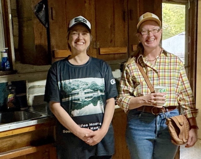 2025-10-06 - Adair County, KY - Photo by Linda Waggener, ColumbiaMagazine.com. Supporters of the Janice Holt and Henry Giles Festival visited in the kitchen of the log cabin. Keysha Tucker and Renee Watson are pictured in the kitchen of the historic log cabin.