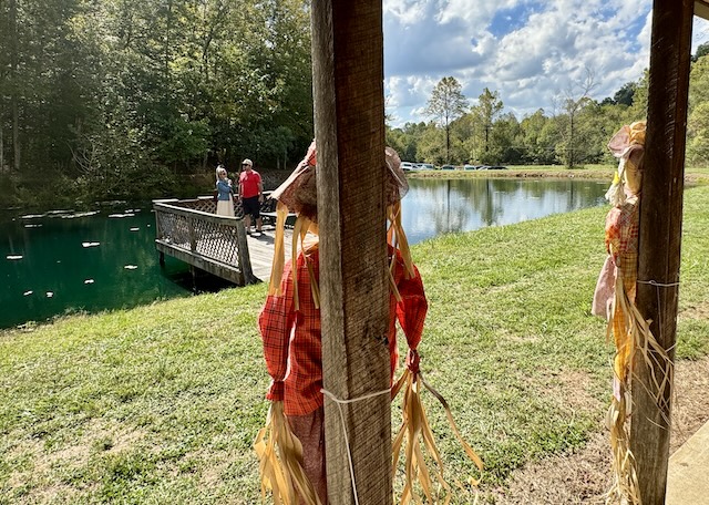 2025-10-06 - Adair County, KY - Photo by Linda Waggener, ColumbiaMagazine.com. Ken and Lynda Wilkerson stopped for visits at one of the booths on the grounds of the Janice Holt and Henry Giles log cabin and lake at the October 4, 2025 Festival. Ken especially wanted to attend because he grew up in the Knifley area.