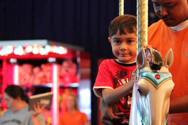 Gustavo riding the merry-go-round at Gatti Town in Lexington, KY, during a very busy month for these Adair County students.
