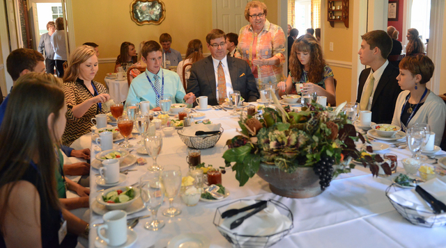 2013-07-16 - Hundley House, 301 Lindsey Wilson Street, Columbia, KY - Photo by Duane Bonifer. LWC photo. Lindsey Wilson College trustee Sue Stivers of Columbia instructs the Rogers Scholars in an etiquette dinner Tuesday, July 9, at the Emily Hundley President's Home. The event was hosted by LWC President William T. Luckey Jr. Clockwise, from lower left: Rachyl Harmon of Clay County, Devin Montgomery of Pulaski County, Donald Damron of Carter County, Chelsea Gray of Knox County, Riley Grant of Adair County, Luckey, Sarah-James Miles of Knox County, Grant Cox of Taylor County and Emma-Cecile Roach-Barrette of Menifee County. - Duane Bonifer, LWC