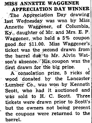 my "archives" and stumbled upon this clipping by chance. Printed in the Adair County News, 15 September 1948. Thought you might get a kick out of it. - Mike Watson. Thanks Mike - If I remember, Appreciation Days were used to stimulate a relatively dead day for commerce in Columbia - Wednesday. In my mind's eye, and with the magnified memory of advanced years, I remember the crowds for The Drawing to have been as big as Happy Chandler and the Bardstown Old Star Band, combined, could draw. Even without the 7 days of fame for being written up in the Adair County News, one had word of mouth fame far beyond that time - as no doubt Annette and Mayor Scott remember to this day. Coincidentally, Annette and Kenneth Scott may be the only two Adair Countians who still look like they did in 1948. Some things stay the same. -EW