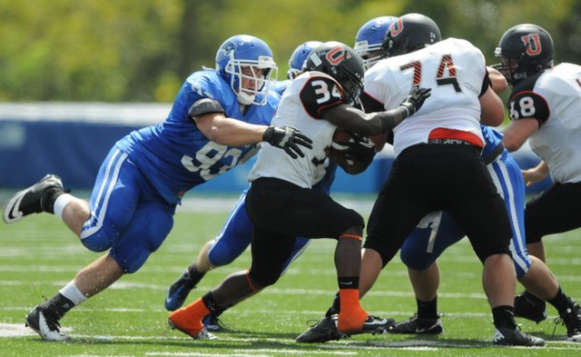 2012-09-02 - 820 Hanley Lane, Columbia, KY - Photo by Duane Bonifer. LWC photo. Lindsey Wilson College's Andrew Wahl of Evansville, IN, corrals Union College's Leonard Dixon during Saturday's game at Blue Raider Stadium. LWC won the home-opener, 36-21, at Blue Raider Stadium in Lindsey Wilson Sports Park.