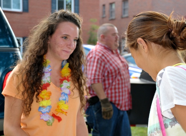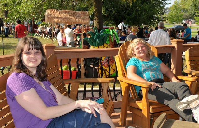 2012-09-02 - Stapp Lawn, Campbellsville University - Photo by Linda Waggener. Kristen Lizer, junior from Lexington, KY enjoyed the BCM Luau dinner under the huge oak trees on Stapp Lawn, on Tuesday, August 28, 2012, with freshman Courtney Humfleet from London, KY. - Linda Waggener, CU
