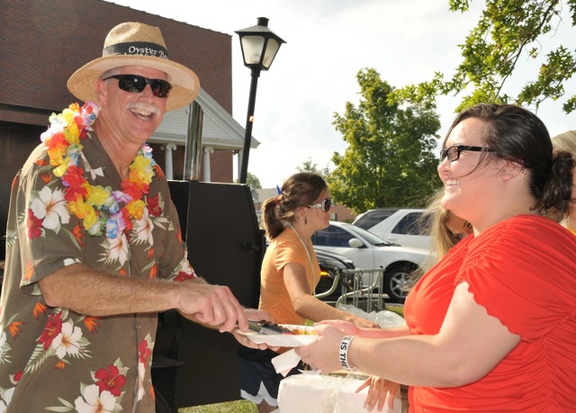 Samantha Ross, sophomore from Willisburg, KY, is served shish kabobs with rice and fresh fruit by Ed Pavy, director of Campbellsville University Campus Ministries, at the Baptist Campus Ministry (BCM) annual dinner, Tuesday, August 28, 2012 - Linda Waggener, CU