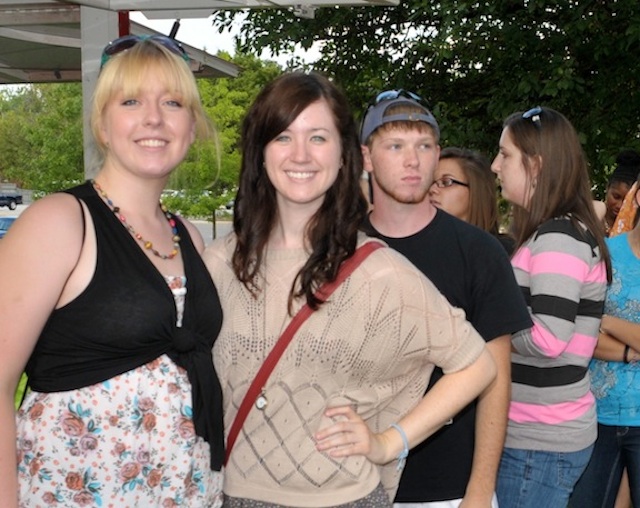 2012-09-02 - Stapp Lawn, Campbellsville University - Photo by Linda Waggener. Erin Gramsley, left, a CU senior from Elizabethtown, and Hannah Baird, senior from Hartford, KY, enjoyed the BCM fellowship dinner August 28, 2012, on Stapp Lawn at Campbellsville University. Behind them, Drew Page, sophomore from Paris, KY, looks ahead to the food line. - Linda Waggener, CU
