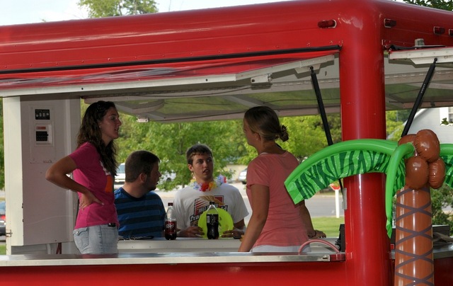 2012-09-02 - Stapp Lawn, Campbellsville University - Photo by Linda Waggener. Serving in the drinks booth at the annual BCM dinner August 28, 2012 are, from left: Kaela Vessels, Vine Grove, KY; Kyle Brewer, Louisville, KY; Andrew Neal, Harrodsburg, KY; and Rebekah Carl from Houston, TX. - Linda Waggener, CU