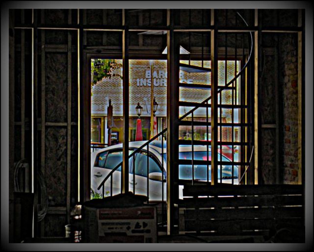 2012-09-02 - 200 Public Square, Columbia, KY - Photo by Ed Waggener. There's a lot going on inside the Red Brick Studio adaptive reuse project, transfoming the Firestone/Mike Harris Building into a state of the art recording studio in downtown Columbia. Looking through the framing, past an Anthony Janes/Fabco spiral staircase through the lamps and historical marker on the Jamestown Street side of the Historic Adair County Courthouse, to the Barger Insurance building on the far side. Owner Mike Harris said there's enough new framing inside the building to build a small house. The studio is expected to be in full use by early November, 2012. Harris' partner Danny Bailey has already booked several sessions.