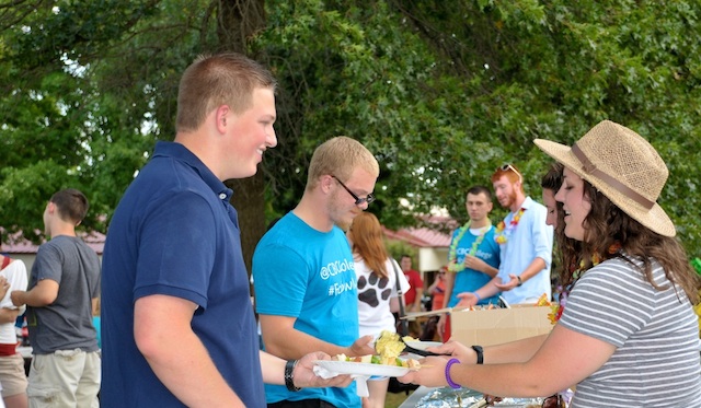 2012-09-02 - Stapp Lawn, Campbellsville University - Photo by Linda Waggener. CU photo. Isaac Petty, a Campbellsville University student from Columbia, KY, accepts a plate from Rachel Shannon, discipleship coordinator, at the annual BCM dinner. - Linda Waggener
