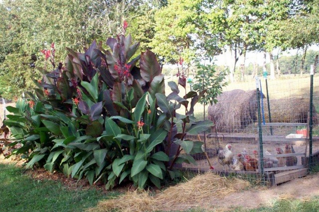 2012-09-02 - Beautiful Joppa, Adair Co., KY - Photo by Maury E. Lewis. The Canna Lilies Maury Lewis planted in late April/early May have grown high above the 5 ft. fence around her chickens, who are now much happier being shaded from the afternoon sun by the beautiful plants. Maury Lewis got the Canna Bulbs from Adair County Garden Club friend Barbara Armitage.