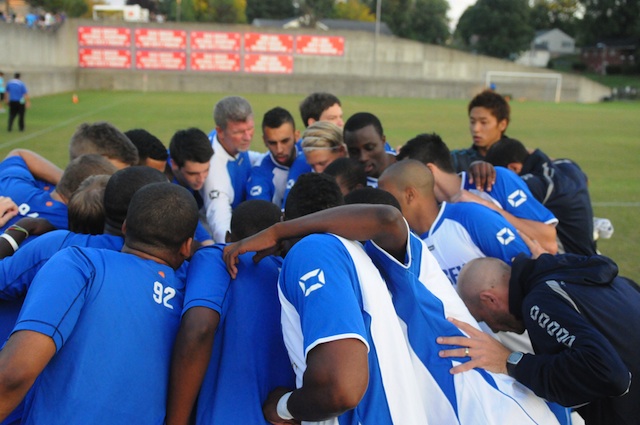 2012-09-02 - Walter S. Reuling Stadium, 151 Holloway Drive, Columbia, KY - Photo Lindsey Wilson College photo. Lindsey Wilson Soccer Coach Ray Wells, top of circle, white shirt encourages team during huddle prior to the coach's 500th career win Saturday, September 1, 2012, at Walter S. Reuling Stadium.