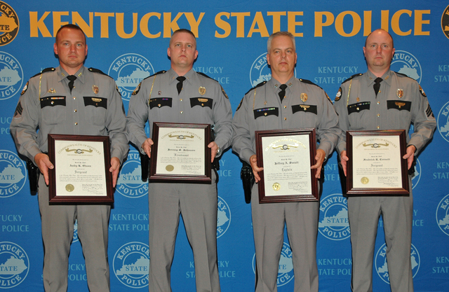 2012-08-28 - Frankfort, KY - Photo By Sgt. Rick Saint-Blancard . Four officers at Kentucky State Police Post 15, Columbia, KY, received promotions at a special ceremony held today, Tuesday, August 28, 2012, at the Capital Plaza Hotel in Frankfort, KY. From left: Sgt. Andy Olson, Lt. Jeremy Johnson, Capt. Jeff Suratt and Sgt. Fred Cornett. - Sgt. Rick Saint-Blancard