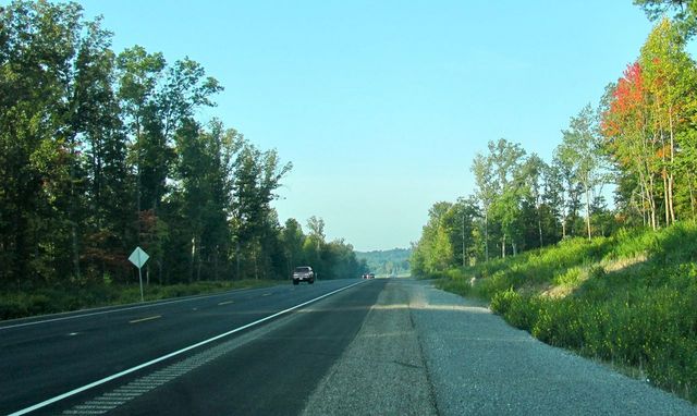 A late August morning and the open road calls south to Sparksville, Breeding, and Burkesville through trees and roadsides with a touch of fall, some already red trees and and fall flowers in plenty. The scene looks down a long straight stretch bypassing The Flatwoods, to nearly to the ascent up and through the Wheeler Hill Pass.