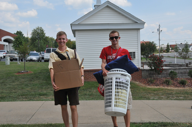 Garrett Baker, left, a senior of Bowling Green, KY, helps freshman Joey Hartlage of Louisville, KY, move into South Hall at Campbellsville University. - Christina L. Kern