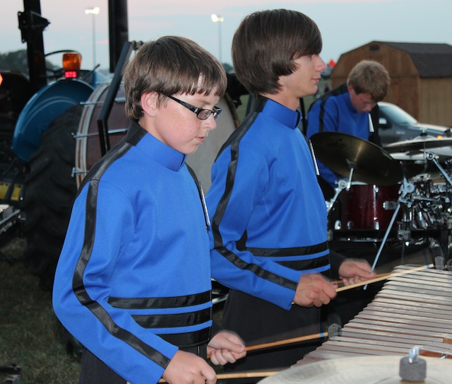 2012-08-26 - ACHS Football Field, 623 Indian Drive, Columbia, KY - Photo by Debbie Cowan. Getting Ready for Mark Twain - Preston Coomer, Landon Coomer and Harrison Rich prepare the Pit section of the Adair County Marching Band for performance on Saturday, August 25th at the Mark Twain Marching Band Festival held in Adair County. – Debbie Cowan