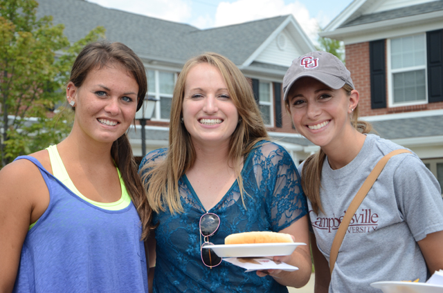 2012-08-26 - Campbellsville University, Campbelllsville, KY - Photo by Christina L. Kern. CU photo. Taking a break from move in at Campbellsville University are, from left: Lindsay Ramage, a sophomore of Jamestown, KY; Kristi Ensminger, a 2010 CU graduate and assistant women's basketball coach; and Jordan Cornett, a 2012 CU graduate who is now working on her master's degree and serving as graduate assistant in sports information. - Christina L. Kern, Campbellsville University