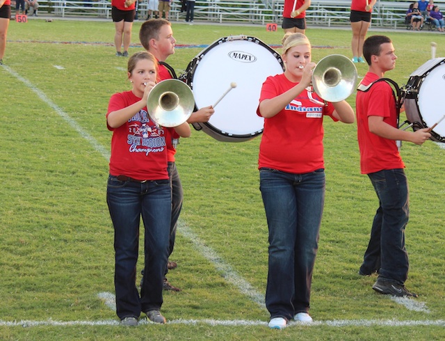 2012-08-25 - ACHS Football Field, 623 Indian Drive, Columbia, KY - Photo by Debbie Cowan. Adair County High School Marching Band members Bailey Harris, Hannah Cockerham, Dusty Claiborne and Josh Grant perform the "fight song" prior to the Adair County vs Caverna football game on Friday night. The band will be debuting their 2012 Show "Deja Blu" at the annual Mark Twain Marching Band Festival on Saturday, August 25, 2012, at the Adair County High School Football Stadium, 623 Indian Drive. Adair County is scheduled to perform. - Debbie Cowan