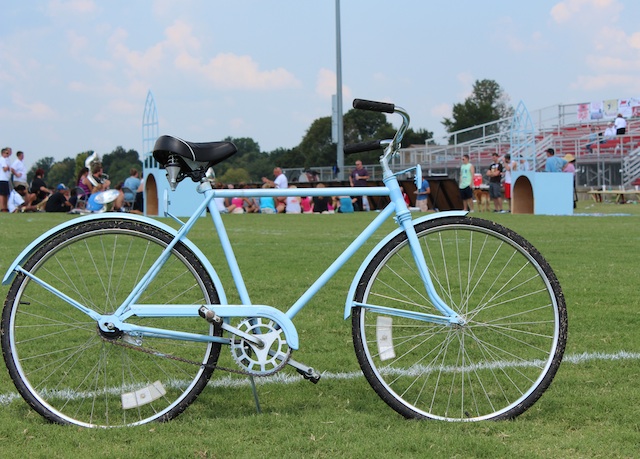 2012-08-25 - Adair County Football Stadium, 624 Indian Drive, Columbia, KY - Photo by Debbie Cowan. This bicycle sits in the end zone of Indian Stadium, at Adair County High school waiting for its exciting role in the debut of the 2012 Adair County Marching Band show "Deja Blu". Adair County Marching Band students are seen in the background receiving some last minute instructions. Spectators for the Mark Twain Marching Band Exhibition will be treated to some creative shows today. Don't miss out! - Debbie Cowan