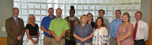 2012-08-24 - Campbellsville, KY - Photo by Joan C. McKinney, CU photo. New faculty members at Campbellsville University pose with Dr. Michael V. Carter, president, back row far left and Dr. Frank Cheatham, senior vice president for academic affairs, far right in back row. Faculty members include from left: Front row - Russ Thompson, assistant director of bands and instructor in music; Anne Adcock, assistantprofessor of social work and Somerset site director; Phoebe Williamson, assistant professor of education; and Jacqueline Young, clinical nursing instructor. Back row - Carter, Kay Gupton, instructor in human performance; Tim Rogers, instructor in human performance; Dr. Karen Westbrooks, assistant master of science in counseling program director and associate professor of counseling; Deborah Spalding, assistant professor of education; Dejan Mraovi