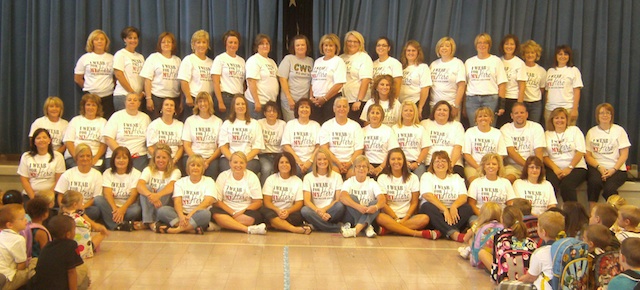 2012-08-24 - Col. Wm. Casey School, 220 Gen. John Adair DR, Columbia, KY - Photo by Tara Burton. Today at Col. Wm. Casey staff members honored one of their own. Vicki Jo Kemp, an instructional assistant in Mrs. Kathy Dean's kindergarten classroom, is battling bone cancer. Recently t-shirts were sold to honor her. Staff members chose today to all wear them as they kick off their Relay for Life fundraising efforts with the first "Relay Lunch" of the year. Julie Cowan, past county chairperson for Relay and a kindergarten teacher at the school, heads up the "Class Act" Relay for Life team for CWC and ACES. Vicki Kemp has been a key person in the team for the past several years. All of the staff at Col. Wm. Casey support Vicki and ask the rest of the county to join in with us!!