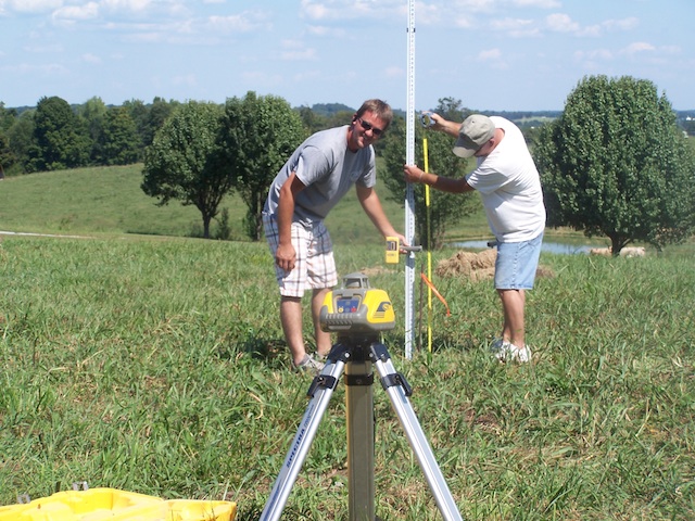 2012-08-25 - Cane Valley, KY - Photo by Fran Neat. Staking Boundaries of Mary's House: Tuesday, August 21, 2012 was the actual date for staking off Mary's House at 550 Beech Top Road. Michael Meyer, left, of Mercy Lane Construction is pictured with Danny Fudge, General Contractor of Fudge and Son Construction, measuring and marking exactly where the house will be built. - Fran Neat