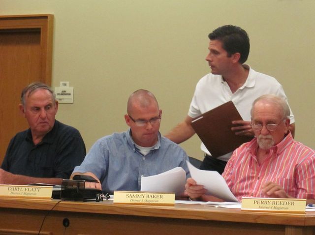 2012-08-21 - 201 Campbellsville Street, KY - Photo by Ed Waggener. Adair County Hospital Vice Chair Craig Pyles who provided the board outline for cost cutting measures with new member Richard Grant, hands out the broad outline of financial changes the Hospital Board agreed to in a 3-0 vote today in a noon session to, from left, Magistrates Harold Burton (District 1), Daryl Flatt (District 2) and Sammy Baker (District 3) during the special called meeting of the Adair County Fiscal Court which convened at 5pmCT tonight at the Adair County Judicial Center, 201 Campbellsville Street, Columbia, Ky