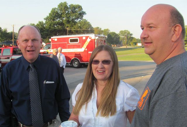 2012-08-22 - 202 Gen. John Adair Drive, Columbia, KY - Photo by Ed Waggener . Charles Sparks Memorial School Bus day: David Jones, Director of Student Transportation, Adair County Special Education Director Anita Goode, and Brandon Lewis, chairperson for the Columbia/Adair County Fire Department's Crusade for Children, chatted before the presentation of the special education bus dedicated in memory of Charle V. Sparks - Sparky - who meant so much to the school children of Adair County. Lewis said that one of Sparky's favorite activities was teaching fire safety at the schools.