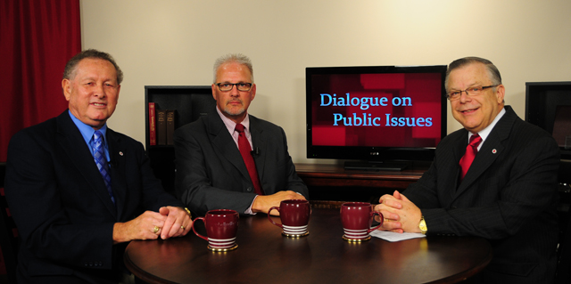 2012-08-22 - WLCU Broadcast Studios, 203 West Broadway, Campbellsville, KY - Photo by Christina L. Kern, CU photo. Campbellsville University's John Chowning, vice president for church and external relations and executive assistant to the president of CU, right, interviews Campbellsville University vice presidents Dr. Frank Cheatham, senior vice president for academic affairs, left, and Dave Walters, vice president for admissions and student services, on his "Dialogue on Public Issues" show on Campbellsville University's WLCU-TV. The show will air Sunday, August 26, 2012 at 8amET; Monday, August 27 at 1:30pmET and 6:30pmET; Tuesday, August 28 at 1:30pmET and 6:30pmET; Wednesday, August 29 at 1:30pmET and 6:30pmET; Thursday, August 30 at 8pmET and Friday, August 31 at 8pmET. The show is aired on Campbellsville's cable channel 10 and WLCU FM 88.7 at 8amET Sunday, August 26.