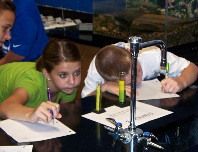 2012-08-20 - Adair County Middle School, 322 General John Adair Drive, Columbia, KY - Photo by Denise P. Grant. Students in Mr. Chris Reeder's and Ms. Denise Grant's 7th grade Science classes at Adair County Middle School experienced their first lab experiment last week. They were learning and practicing the skill of reading a meniscus in a graduated cylinder. This is the beginning of many procedures they will perform throughout the school year! Mr. Reeder's students, from leftJordan Farmer, Charity Frost and Treyton Gist- Denise P Grant