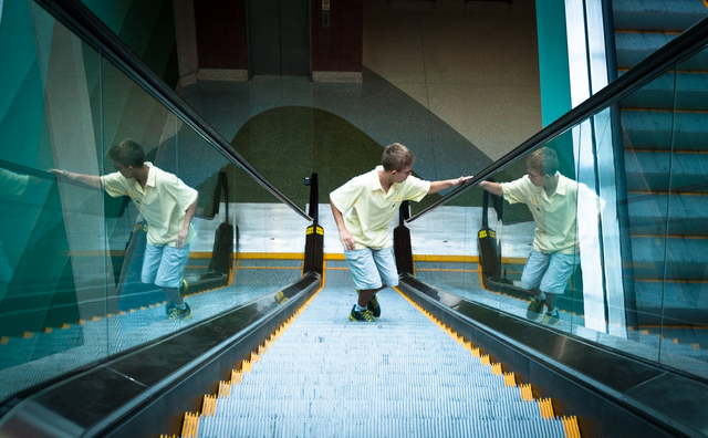 2012-08-20 - Louisville, KY - Photo by Pen. Empirical evidence would suggest that Graham will enjoy at least another 31 years of enchantment with gratuitous escalator rides. As an added bonus, these escalators in the South Wing of the Fair and Exposition Center offered a great overhead view of the annual Ugly Lamp Competition sponsored by Lynn's Paradise Cafe.
