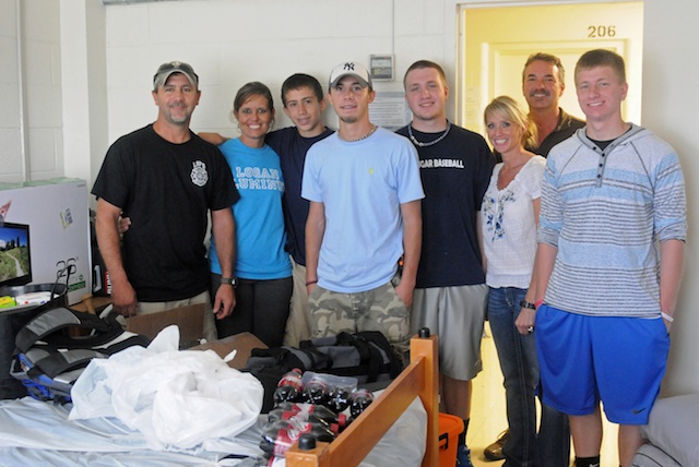 2012-08-19 - Horton Hall, 259 Holloway Drive, Columbia, KY - Photo by Duane Bonifer. LWC photo. Lindsey Wilson College freshmen Dustin Nash and Ryan Harper have been friends since they played t-ball together as 5-year-olds. The two longtime friends will be roommates in the college's Horton Hall. From left: Nash's parents, Tracy and Raquel; Nash's brother, Dalton, and Nash; Harper; Harper's parents, Christy Harper and Jerry Barnette; and Harper's brother, Matt.
