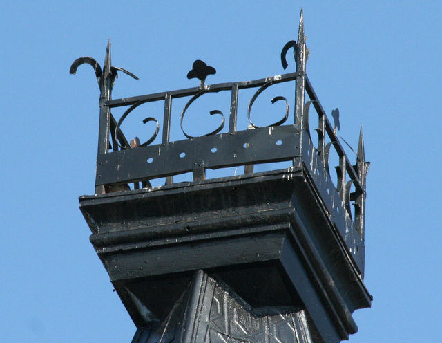 2012-08-17 - 500 Public Square, Columbia, KY - Photo by Old Coddger. Courthouse Spire: Decoration can be what we want them to be. Old Coddger writes: "I read the article where there is some concern as to the 6s on top of the old courthouse. I remembered that I had taken some pictures of this a couple years back and thought I would send this along for all to see. I can see where from the ground it does look like sixes, but when viewed closer, they can be seen as Gs, or maybe just a decoration. I really think it is the eye of the beholder. They can be what we want them to be "- OC. Thanks OC Almost everyone in the world thinks they are merely a decoration. But then, there are folks who see pornography in cloud formations. - CM