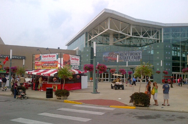 2012-08-17 - Louisville, KY - Photo by Pen. A new low or a new high in over-the-top "fair food," Donut Burger replaces the traditional hamburger bun with a grilled raspberry-filled from Krispy Kreme. Seen in front of the South Hall of the Fair and Exposition Center at yesterday's opening of the Kentucky State Fair, August 16, 2012.