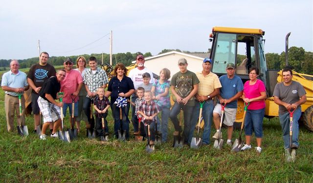 2012-08-17 - 550 Beechtop Road, Columbia, KY - Photo by Fran Neat. Groundbreaking Ceremony for Mary’s House at 550 Beechtop Rd. took place at 6pmCT, Thursday, August 16, with approximately 50 people in attendance. This completes Phase One of the project. Chairman, Larry Neat, welcomed everyone with comments being given by various committee members. The property and Mary’s House were both blessed by Bro. Paul Patton and Bro. Troy Long as they offered prayers and thanks to the Lord for His guidance and the outpouring of community support for this project. From left Jim Flowers, Kyle Cundff, Larry Neat, Danny Fudge, Melissa Fudge, Ronnie McGuffin, Alex McGuffin, Mary McGuffin, Don Neat, Dustin McGuffin, Robert McGuffin, Andrew McGuffin, Nikki McGuffin, Terry McGuffin, Jerry Watson, Doug White, Debbie White, and Daniel Nissley. The groundbreaking shovels were provided by Burton Ace Hardware and Jeffries Hardware.